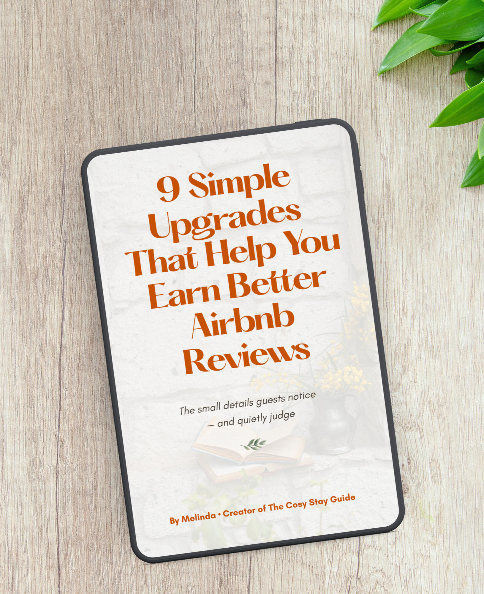 This short, focused guide walks you through the upgrades that most strongly influence guest comfort, calm, and confidence — without big renovations or big budgets.Inside, you’ll learn how to:🌿 Bedding, pillows, towels & bathroom details guests notice🌿 Lighting, textiles & storage that reduce stress and friction🌿 Small gestures guests remember in reviews🌿 Real examples from a highly rated Airbnb🌿 A guest-first way of thinking you can apply anywherePractical, honest, and based on real hosting experience — not theory.If you want to improve reviews without overthinking every detail, this guide is a great place to start.