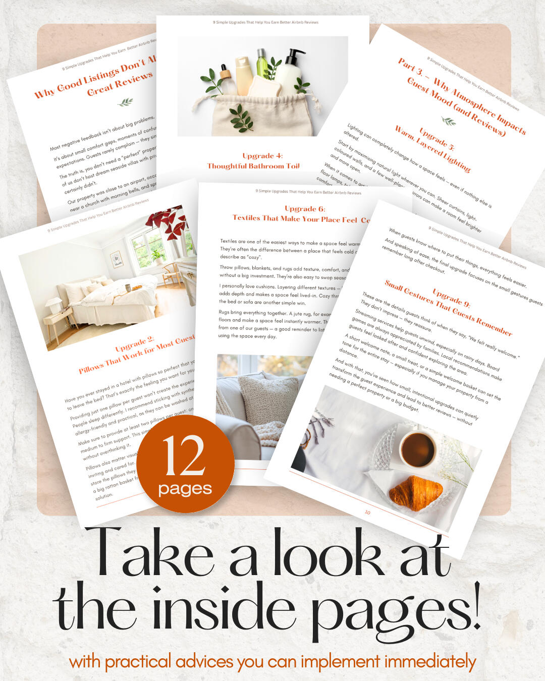 This short, focused guide walks you through the upgrades that most strongly influence guest comfort, calm, and confidence — without big renovations or big budgets.Inside, you’ll learn how to:🌿 Bedding, pillows, towels & bathroom details guests notice🌿 Lighting, textiles & storage that reduce stress and friction🌿 Small gestures guests remember in reviews🌿 Real examples from a highly rated Airbnb🌿 A guest-first way of thinking you can apply anywherePractical, honest, and based on real hosting experience — not theory.If you want to improve reviews without overthinking every detail, this guide is a great place to start.